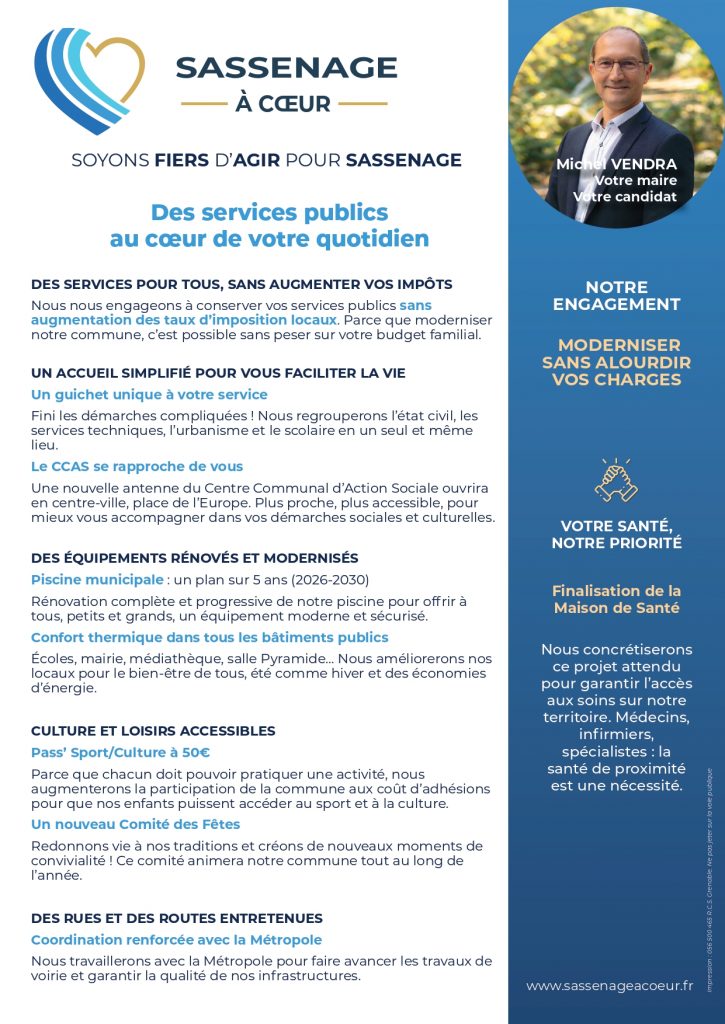 Parmi les idées mises en avant par l’équipe sortante de Michel Vendra, Sassenage à cœur, figure la création d’un accueil centralisée regroupant plusieurs services municipaux : état civil, urbanisme, scolaire ou encore services techniques, afin de simplifier les démarches administratives des Sassenageois et Sassenageoises. Le projet prévoit également l’ouverture d’une antenne du Centre communal d’action sociale (CCAS) en centre-ville, place de l’Europe, pour rapprocher l’accompagnement social des habitants et améliorer son accessibilité.